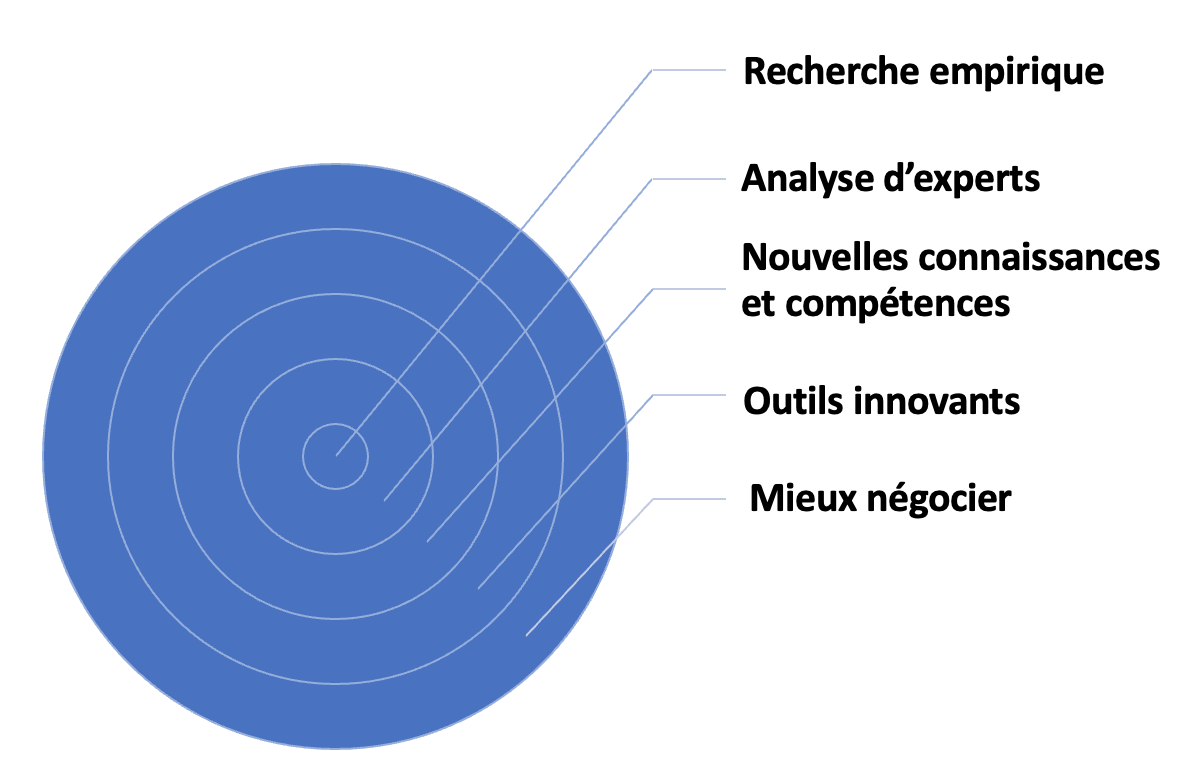 Il y a plusieurs étapes interdépendantes sur la voie de l’amélioration des performances de négociation. La recherche sur le terrain est le point de départ, car les théories et les preuves anecdotiques ne sont pas fiables et conduisent souvent à des conclusions erronées ou incomplètes. L’analyse par des experts des résultats de la recherche dans le monde réel peut souvent produire des résultats surprenants, conduisant à de nouvelles connaissances à partir desquelles de nouvelles compétences peuvent être développées et partagées. Ces nouvelles connaissances, en particulier lorsqu’elles sont combinées à de nouveaux développements scientifiques et technologiques, peuvent donner naissance à de nouveaux outils révolutionnaires qui, à leur tour, peuvent améliorer les compétences et améliorer la pratique.
